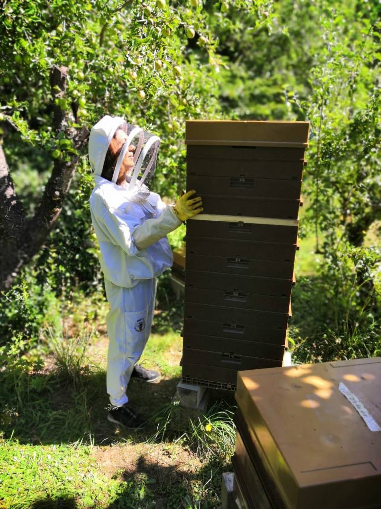 Cette ruche a tellement bien travaillĂ© en accumulant des hausses Ă miel que l’apicultrice va devoir aller chercher une Ă©chelle pour s’en occuper đ