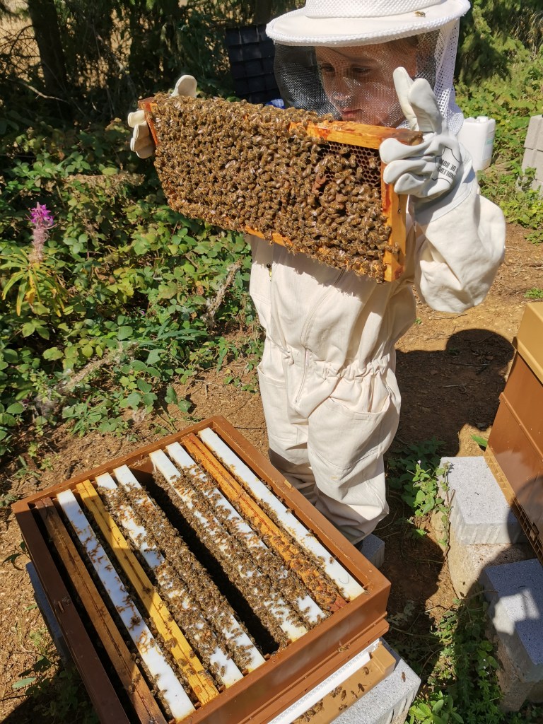 ‘Where is the queen? » asks our little beekeeper đž