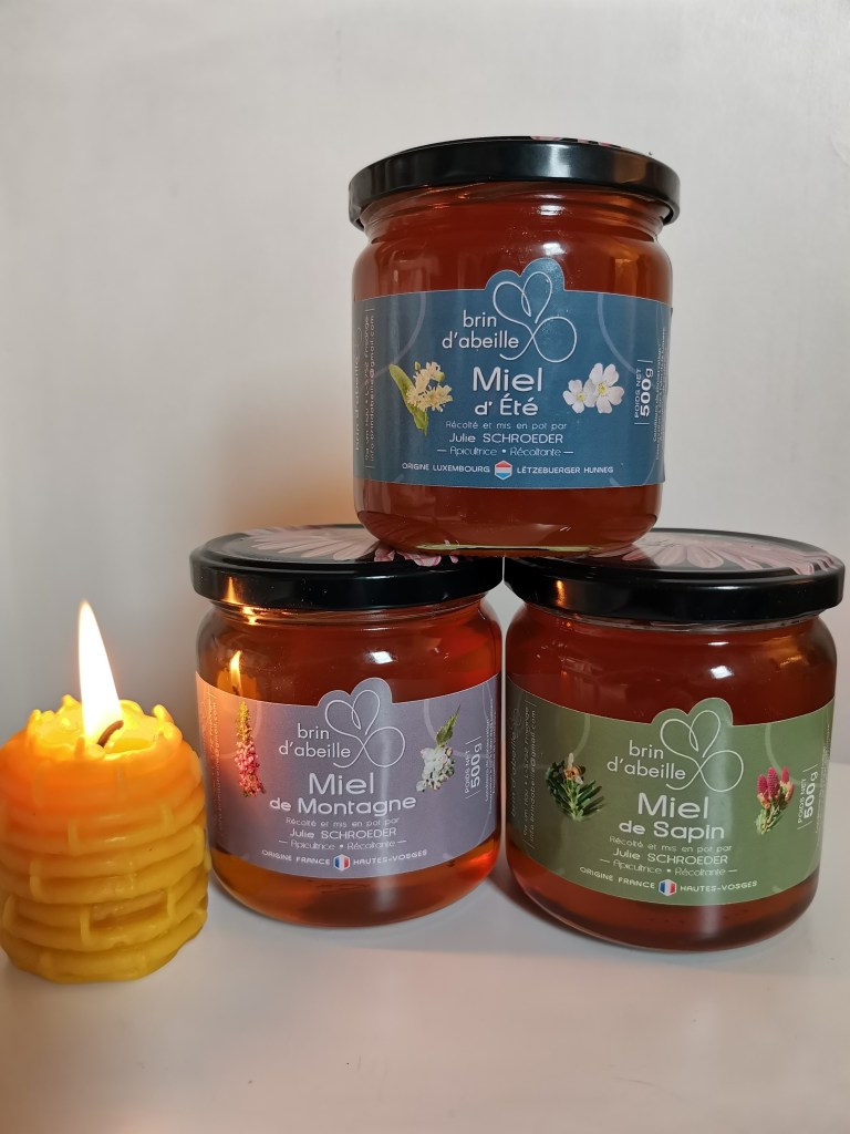 Le miel d’été est liquide et a un goût acidulé, on y retrouve (entre autre) du tilleul, des mûres et de la lavande. Idéal pour apaiser, le corps comme l’esprit, disponible en pots de 250g et 500g.