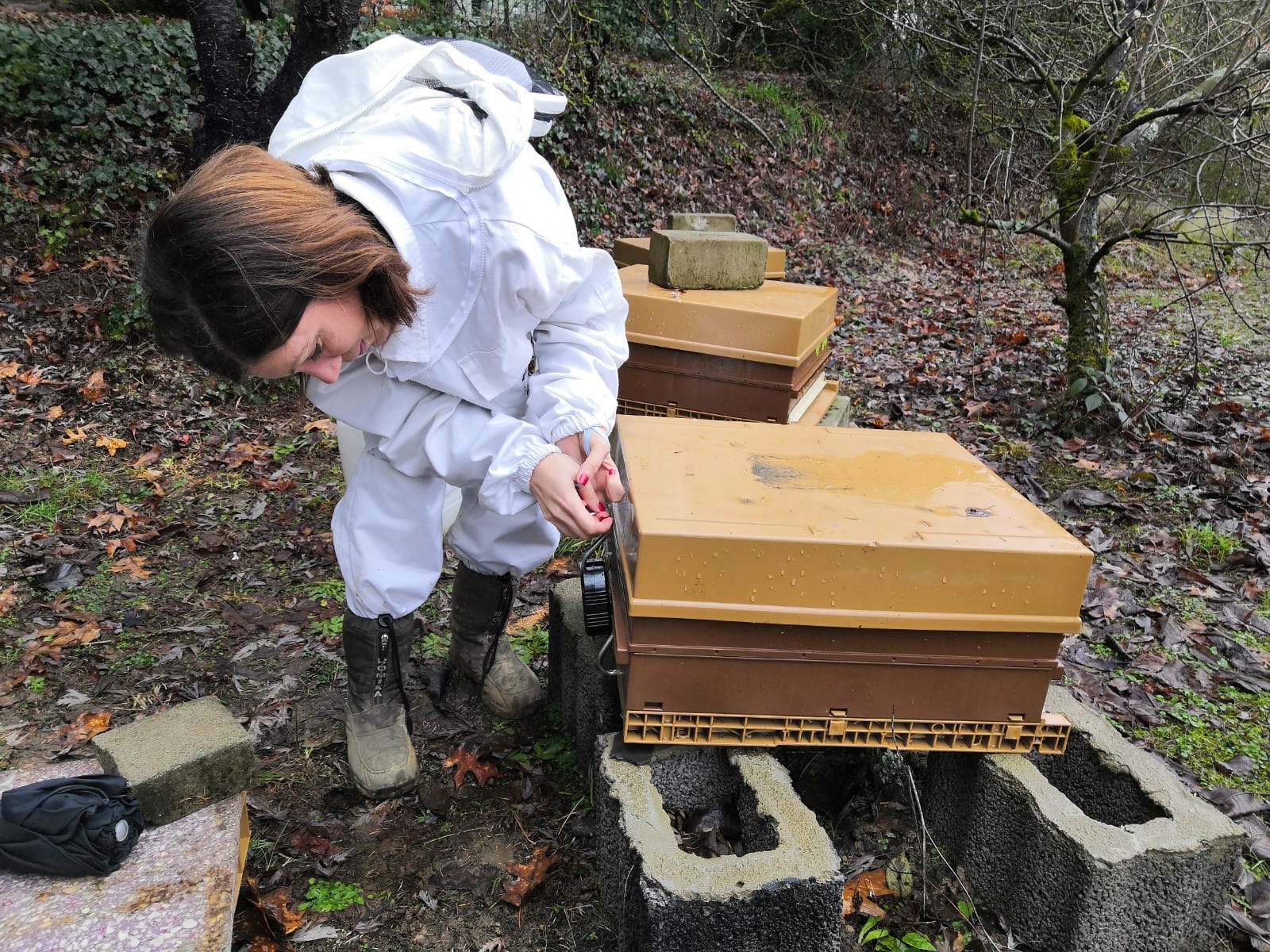 ⚖️ Yesterday at the Luxembourg-Cents apiary. We seized the opportunity of milder temperatures to check the weights of the hives. This allows us to avoid opening the hives and therefore disturbing the bees. Using a load-cell, we weigh at the back and then compare the weight with the one from before the winter. This gives us an approximate idea of how much reserves have been consumed, and what remains.