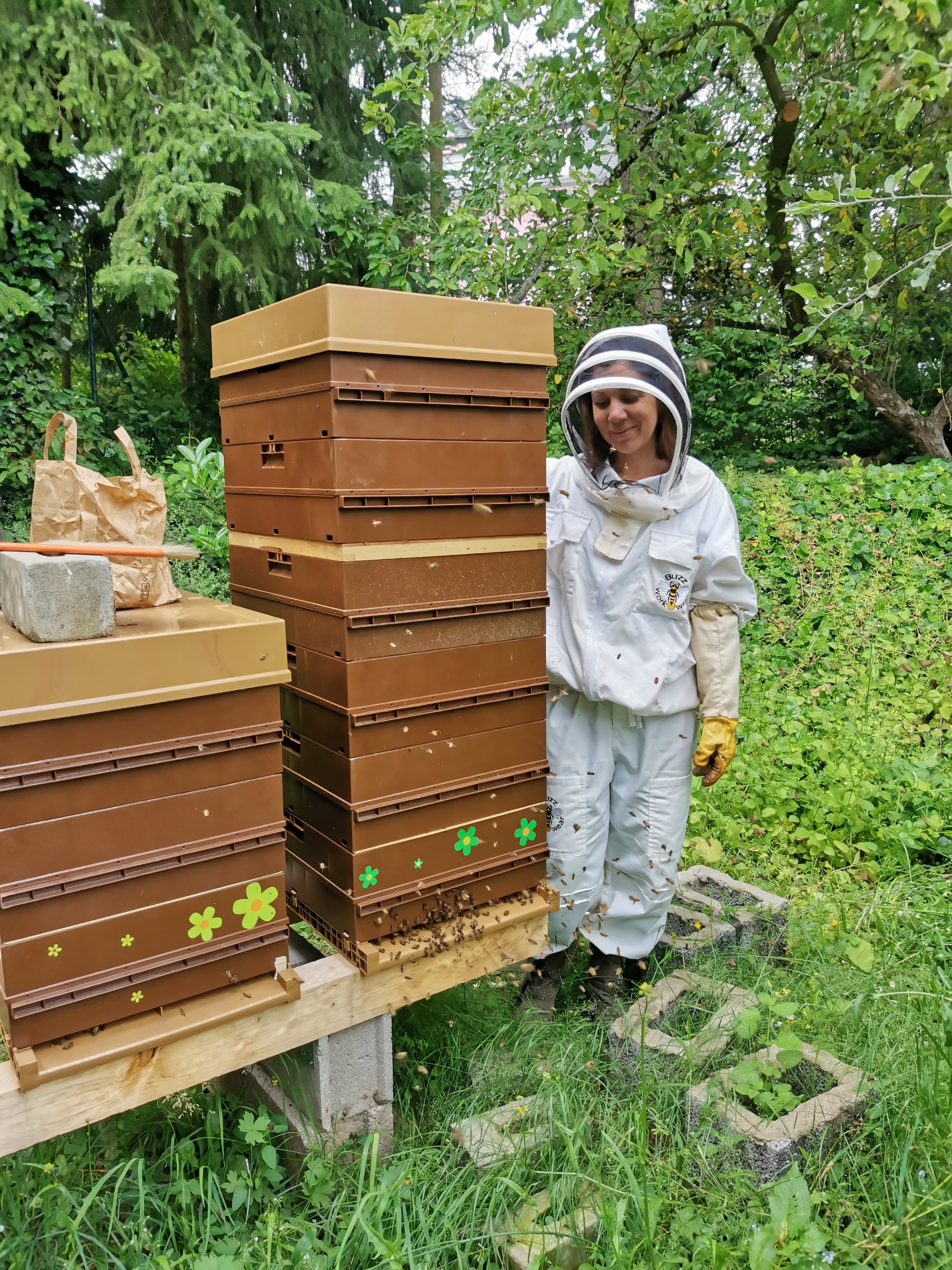 Great activity this afternoon at our apiary in Cents, coupled with a small harvest! There are only a few hives but fortunately as we can see the hive called « Freya » is very strong and with its honey supers it is even taller than its beekeeper 🤪.