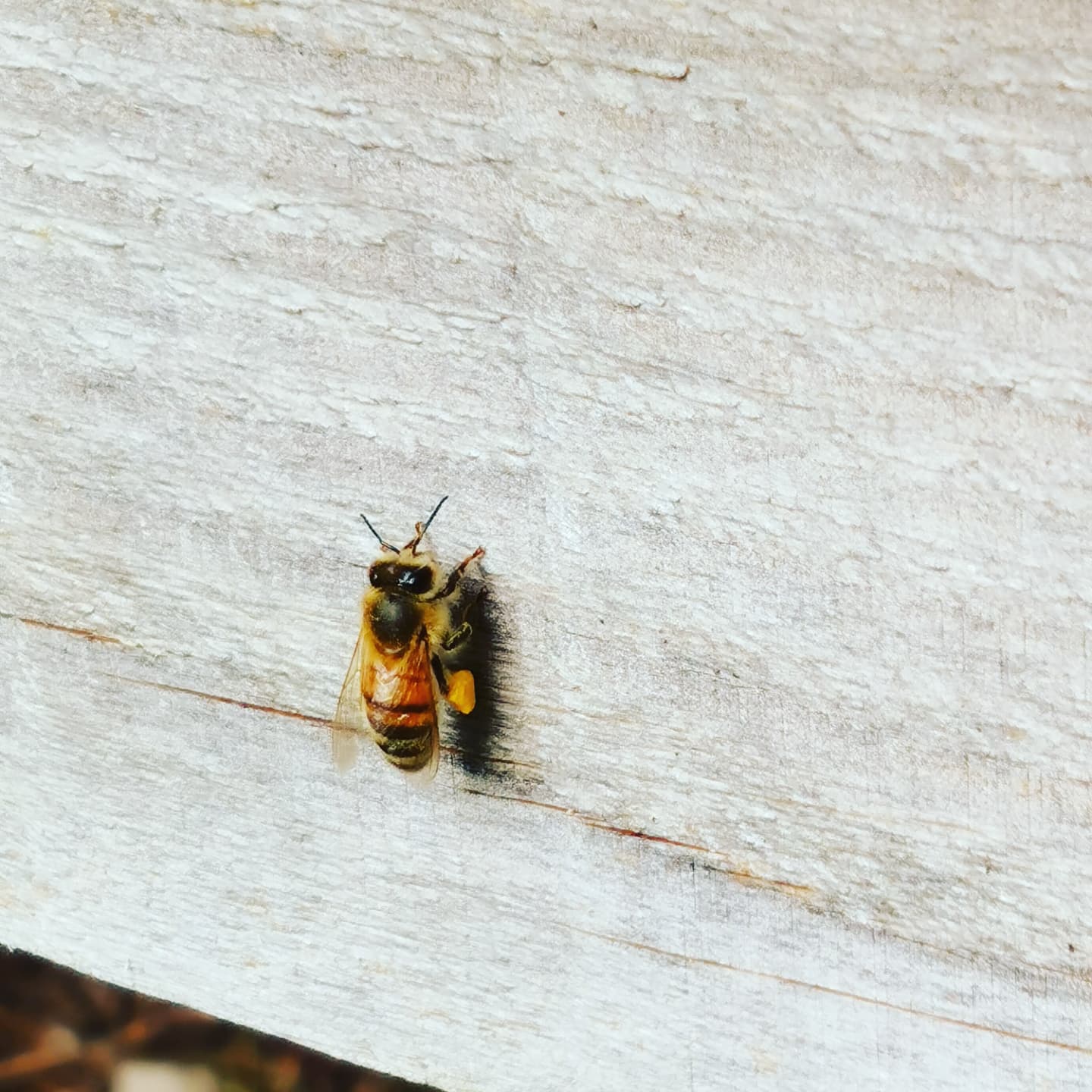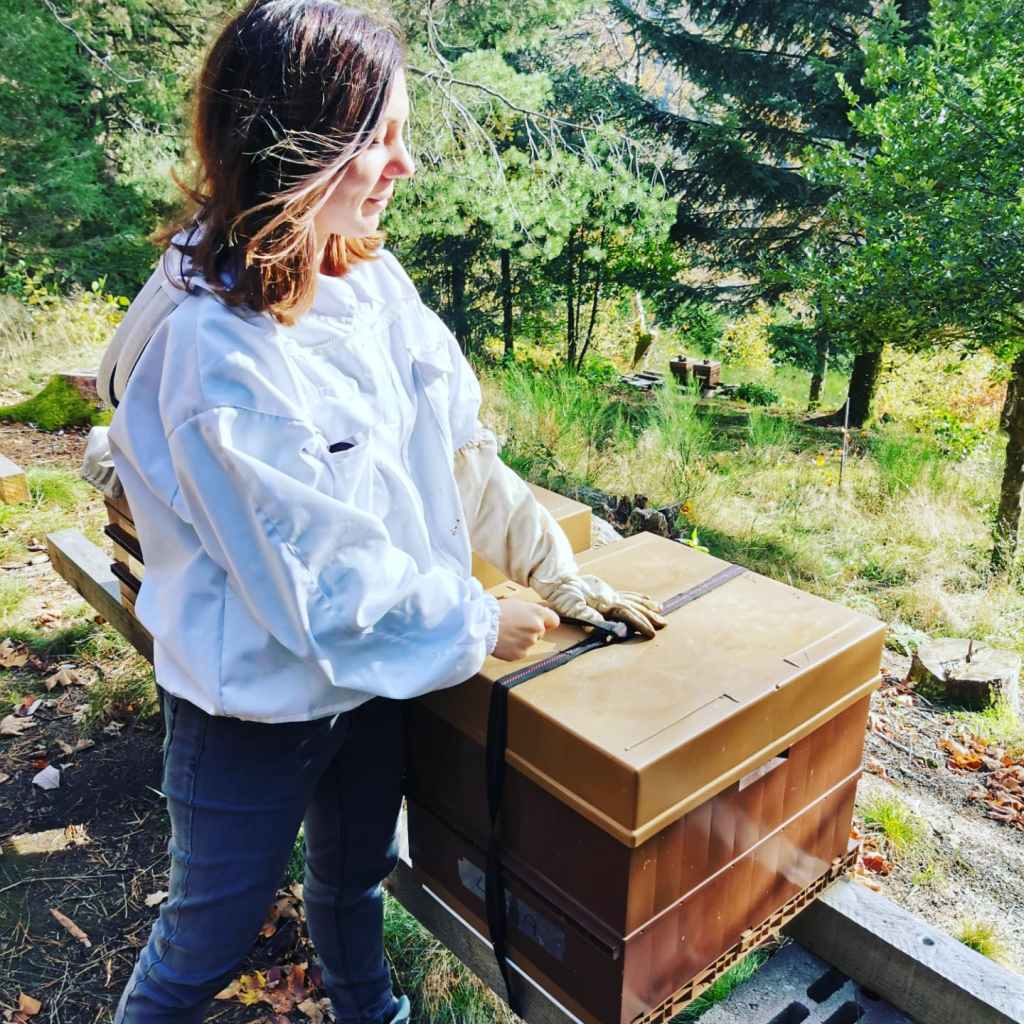 For the past few weeks we have been busy preparing the winterizing of our bees. Due to the low temperatures we avoid opening the hives in order not to cool them down unnecessarily (bees maintain a temperature of about 35 degrees in the hive around the queen). Our job as a beekeeper at the apiary in the fall consists of weighing them, which gives us an idea of the state of their reserves, strapping them as we see in the photo to avoid violent gales that would knock them down, and check the surroundings of the hives. It is a quieter phase, which can be good after a hectic season, but which can also seem long to passionate beekeepers who are in need of their bees! Fortunately on sunny days these tireless workers đ go out to look for pollen, as we can admire in one of the photos, and the passionate beekeeper never tires of admiring them again and again đ.