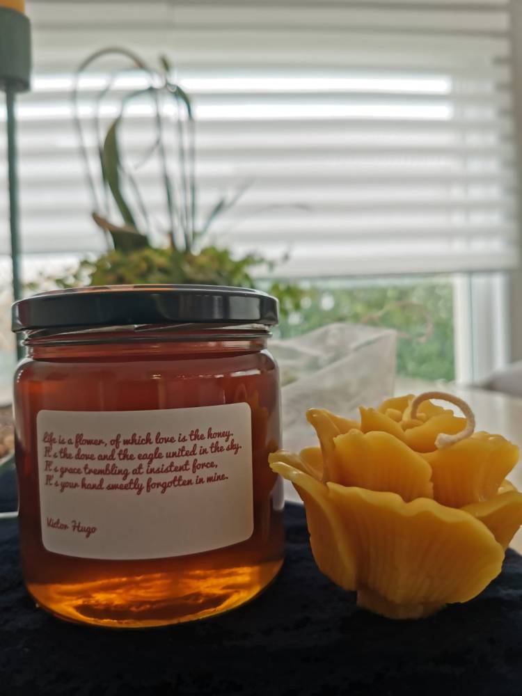 - Un pot de 500g de notre miel de montagne avec étiquette texte de Victor Hugo